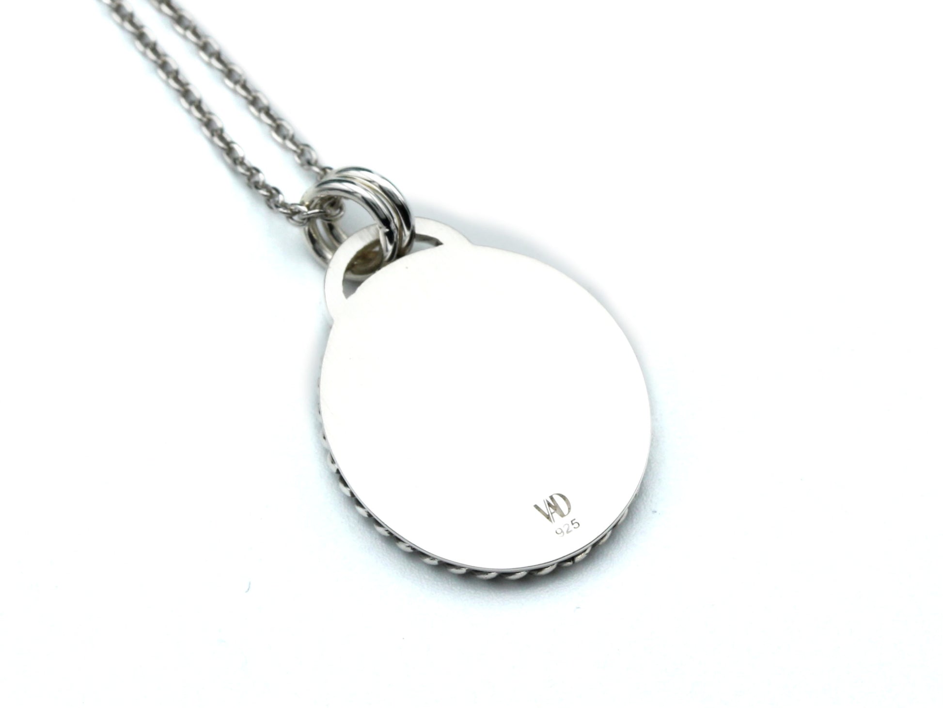 Each necklace is handmade by Virginia Ann Designs in Frederick, Colorado exclusively for English Rose Farm. The design is created by computer and laser engraved into a sheet of pure sterling silver. A border of twisted sterling silver wire wraps around the image and is soldered into place. Two jump rings are connected to the top of the pendant and welded together for maximum durability. The background of the pendant is darkened to maximize contrast and the border is antiqued for a beautiful, vintage feel.